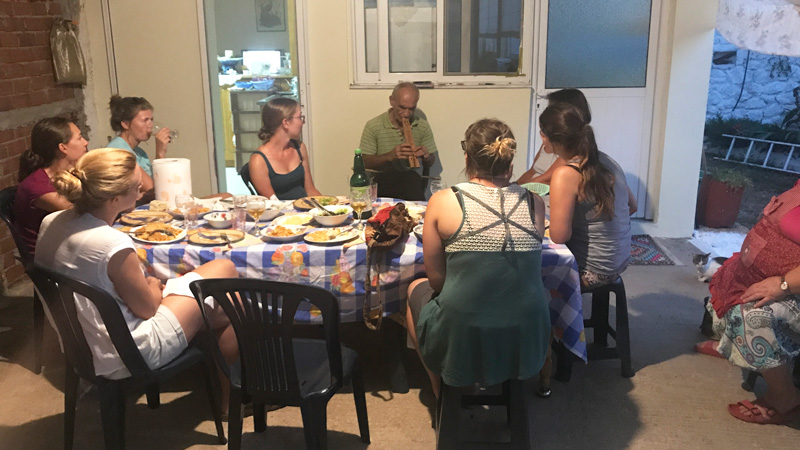 Sent på eftermiddagen kommer ni att anlända till ett familjehus där ni spenderar kvällen och natten. Värdarna bjuder på hemlagad traditionell mat, ofta tillagad med olivolja, som är riklig i regionen. Ni kan även njuta av lokalt vin, raki (en traditionell albansk sprit) och bergste, som hjälper er att slappna av efter en lång riddag. På kvällen kan ni njuta av återkomsten av herdarna (får och kor). Ni är även välkomna att mata eller borsta hästarna en gång till.
