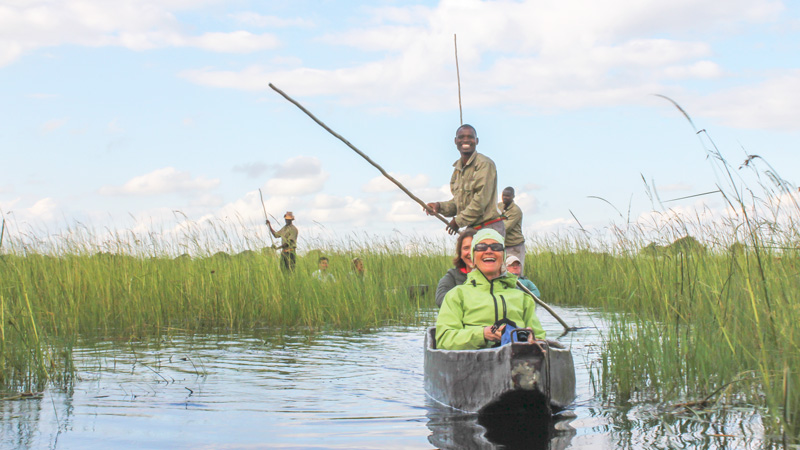 Vatten: Okawangos årliga flodvatten anländer normalt i maj eller juni. När vattennivån stiger går det att åka båt kanot (mokoro).