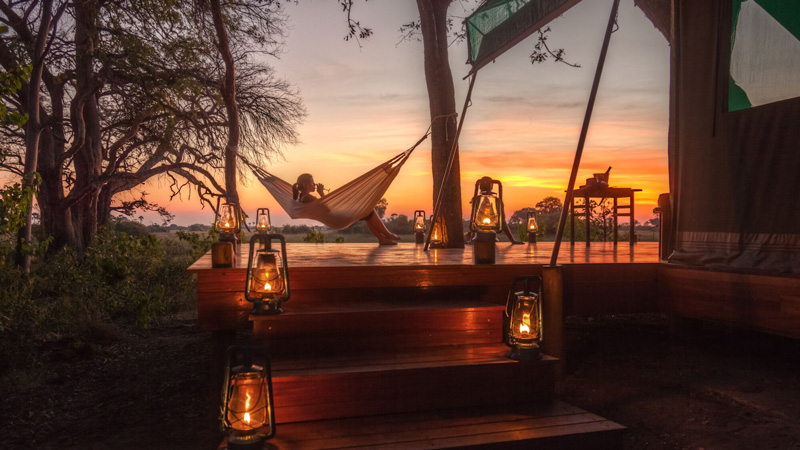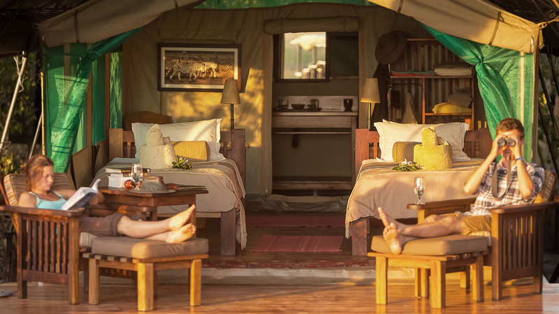 Detta är en mycket bekväm safari där du bor alla nätter i den permanenta campen. Den består av åtta rymliga tält, med egen dusch, och alla med underbar utsikt. Det finns också ett smekmånadstält med jacuzzi. Centralt finns det ett stort möblerat ”tält” med matsal och pool. Maten som serveras är flerrätters och vällagad av ett professionellt team och till måltiden serveras kvalitetsviner.