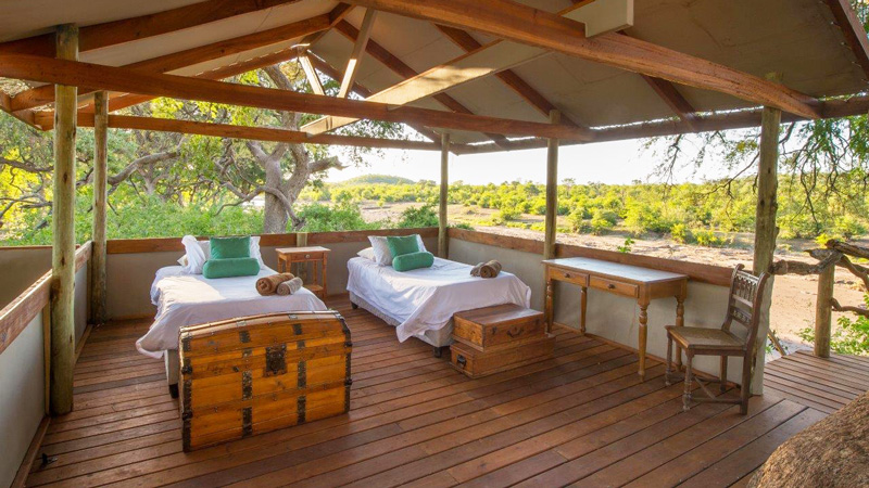 Two Mashatus Camp ligger inbäddat i skuggan av ett Mashatuträd. Här finns två traditionellt byggda rondavels med Lalapalmtak som fungerar både som matplats och vardagsrum. Här bor du i stora safaritält med riktiga sängar. Egen "hot bucket" dusch och toa. Varje tält är privat och placeras i skuggan av ett träd med en liten däcksyta som du kan koppla av på under eftermiddagen. Här bor du den första och de två sista nätterna.
