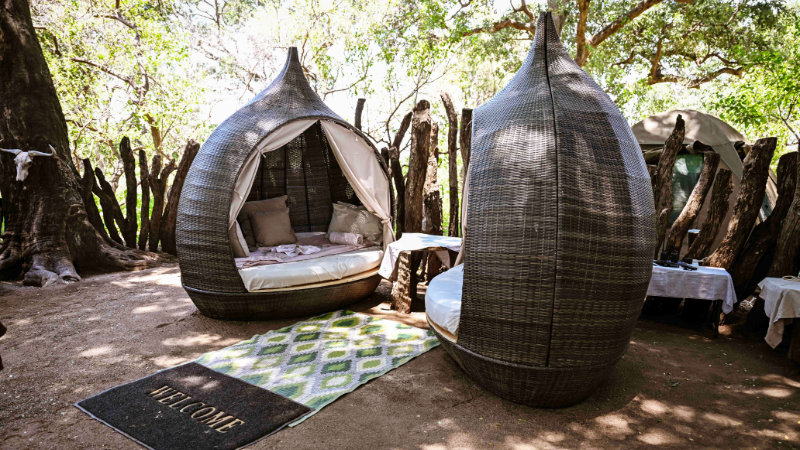 Tree Camp Detta är varje barns dröm: bokstavligen ett läger i ett träd. Ett unikt läger byggt 4 meter över marken, runt grenarna av ett forntida Mashatu-träd och två blyträd. Denna plats med utsikt över Majale-floden erbjuder en spektakulär panoramautsikt över de intilliggande klipporna och slätten mittemot där Mashatus legendariska elefantbesättningar vandrar. Fem vackra, rymliga takytor med takdukar inrymmer himmelsängar och klassiska antika möbler. Det finns en rymlig matsal och lounge på den upphöjda plattformen för avkoppling. Detta verkligen extraordinära läger är ett som du kommer att minnas under kommande år.