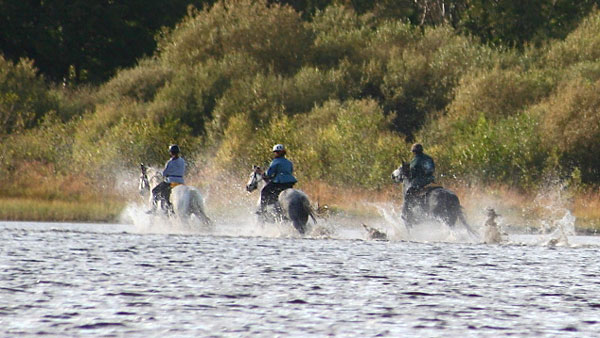 Spännande ridning – branta upp- och nedförsbackar, ridning genom vatten flera gånger, och till och med genom en sjö!