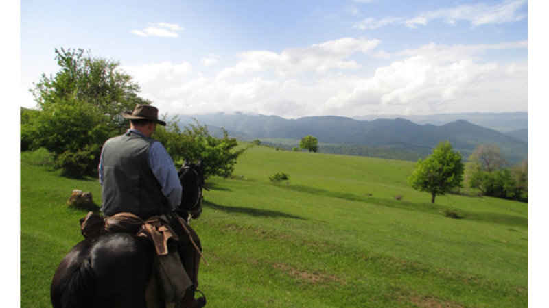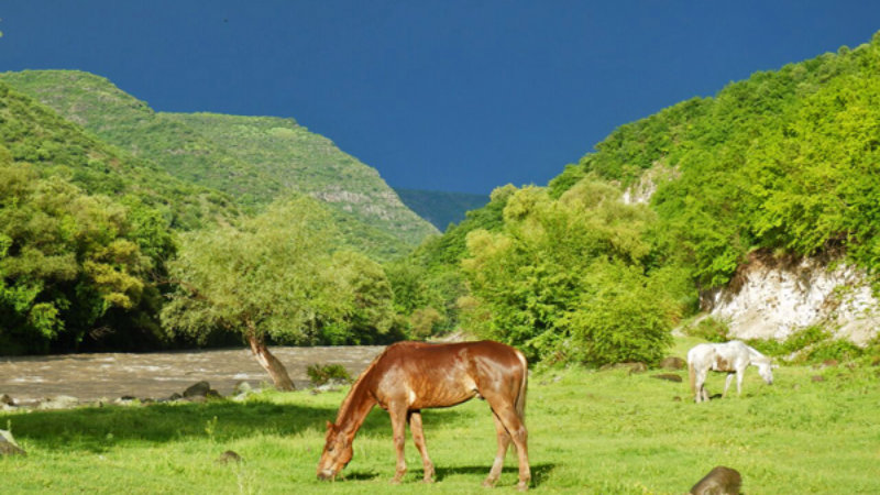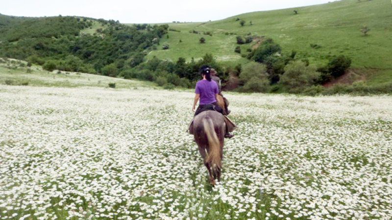 Dag 4 - Frukost i lägret och sedan en chans att njuta av naturen i en timme medan lägret packas ihop. Sedan rider ni genom bokskogen till Gudarekhi-klostret, som är omgivet av ruinerna av Gudarekhis gamla stad (cirka 1 timmes ritt). Detta underbara 1100-talskloster, med sitt vackra flerfärgade klocktorn i sten, är nu obebott. Huvudkyrkan står fortfarande kvar, omgiven av många ruiner, och det finns en underbar mytisk känsla över denna sago plats. En picknick läggs upp i valnötslundarna som omger klostret och det finns tid att utforska före lunch. På eftermiddagen rider ni vidare, först genom skogar igen och sedan till öppna gräsmarker dit herdarna tar med sina får för sommaren genom att använda samma gamla väg som har varit en del av sidenvägsnätet. Du kan ha turen att möta hjordarna av får och nötkreatur, med ryttare på lokala ponnyer eller åsnor och med några flockdjur som bär sina förnödenheter för sommaren. Koklockorna och de sjungande ryttarna hörs ofta över dalarna. Fortsätt genom gamla bokskogar och ängar med vilda blommor tills ni kommer till byn Ivanovka (cirka 3 timmars ritt). Natt på pensionatet hos en lokal familj.