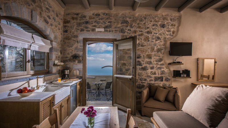 Unika rum: Varje hus är unikt inrett med lokala möbler och dekorativa detaljer som speglar den kretensiska kulturen. Rummen har bekväma sängar, vackra textilier och ofta traditionella eldstäder.