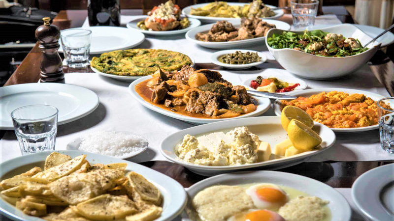 Mezze: Små aptitretare och förrätter som dolmades (vinblad fyllda med ris), tzatziki (yoghurtdipp med gurka och vitlök), och fava (puré på gula ärtor) serveras ofta som en del av en måltid.