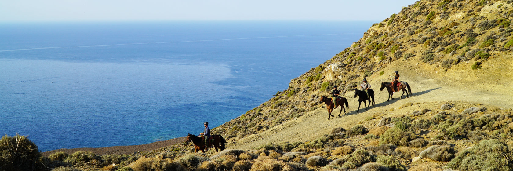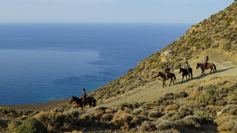 Dag 6: Ni äter frukost i klostrets trädgård, sadlar hästarna och ger er av mot Agios-Ioannis, nära de antika utgrävningarna av Phaistos. Er väg följer över klipporna ovanför den branta kusten längs en smal, ibland klippig stig, omgiven av träd. Vissa passager måste hästarna ledas på grund av markförhållandena. Ni belönas med hisnande vyer över den branta kusten, klippor och grottor. I Agios-Ioannis har ni möjlighet att simma i havet och njuta av en läcker lunch. Därefter tar er en bred serpentinväg er tillbaka till byn och stallet, som ni når på eftermiddagen. Ridtid minst 5 timmar.