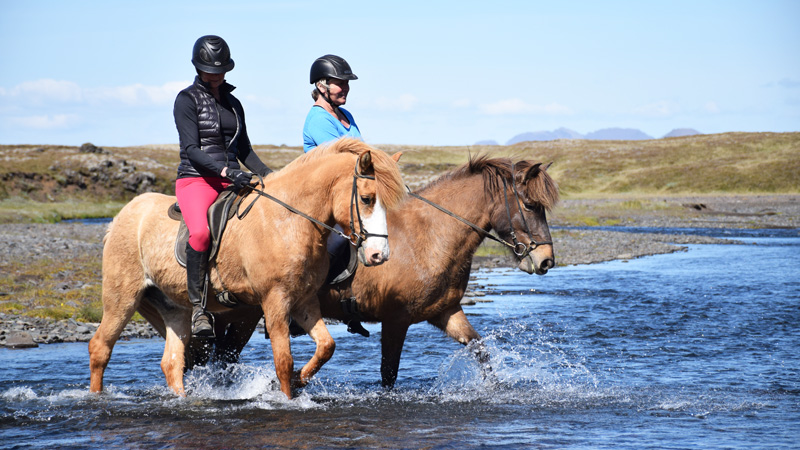 Efter frukost sadlar ni upp och förbereder er för turen. Du får lära känna din häst först innan ni ger er iväg. Sedan ger ni er av över bron vid Þverá och rider genom gröna fält norrut. Ni kommer att vara omgivna av magnifika vyer, med vulkanen Hekla framför er och Eyjafjallajökull till höger. Er första riddag avslutas på gården Stóra-Hof, där hästarna får stanna tills nästa morgon. På vägen tillbaka till ert boende, stannar ni vid ett av Islands mest berömda och fotograferade vattenfall: Seljalandsfoss. Ni får möjlighet att gå bakom vattenfallet och se det i det mest fantastiska eftermiddagsljuset, innan ni återvänder till ert gästhus och njuter av middagen där.