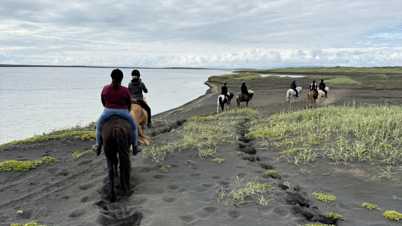 Idag rider ni på en svart sandstrand. På morgonen rider ni längs en flod ner till Grimstaðir, där ni äter lunch. På eftermiddagen rider ni till stranden, med havet på ena sidan och bergspanorama med spektakulära Eyjafjallajökull på andra sidan. Ni töltar genom dynerna (om den djupa sanden tillåter) och korsar tidvattenfloder.