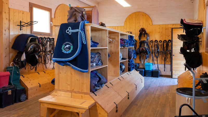 Mellan ridpassen kan du titta på de andra som har lektion eller när tränaren tränar sina tävlingshästar. Du kan även slappna av i det eleganta klubbhuset eller njuta av den två hektar stora anlagda trädgården med infinity pool, jacuzzi, solterrasser, lusthus, bbq och den eleganta uteplatsen. Huvudhuset ligger cirka 200 meters promenad mellan hagarna ovanför ridanläggningen.