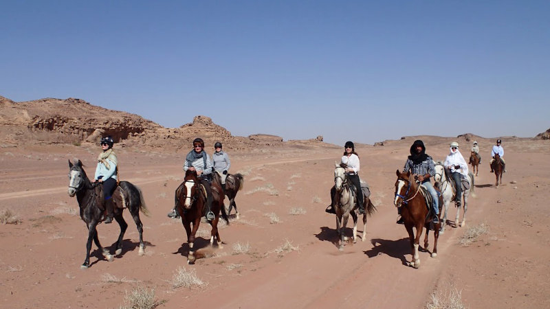 Dag 4. Taibah - Al Rajif - Beer Hammad. Efter frukosten rider ni från berget Taibah till den gamla byn Rajif, som har fantastisk utsikt över Wadi Araba-öknen. Stannar för lunch i skuggan av en trädgård. Efter lunch fortsätter ni rida längs Silk Road som användes av karavaner av handeslmän. Det finns möjligheter för långa galopper över slätterna i riktning mot Ber Hammad (en gammal nabatisk karavan cistern). Camping natt.