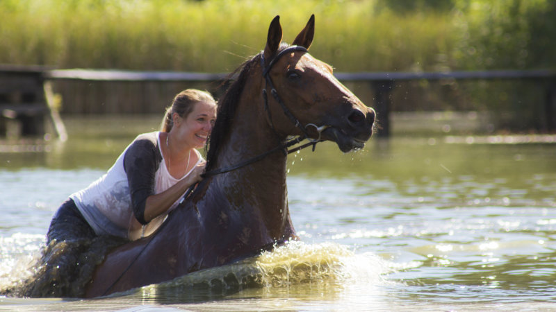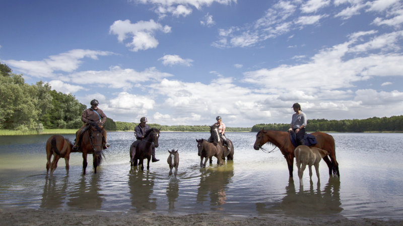 Dag 4: Vi rider genom det unika naturliga paradiset Dramburgs sjödistrikt, genom vackra, ödsliga skogar och längs klara, förtrollande sjöar. Vid fint väder planeras omfattande badpauser för häst och ryttare. Före eller efter middagen kan du välja mellan bastu eller ett dopp i sjön.
