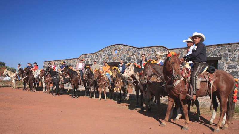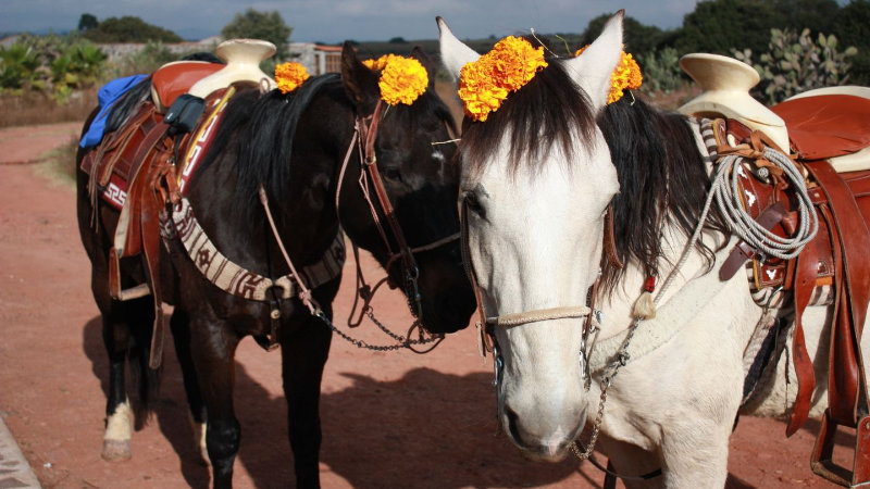 Det finns många cermonier och festligheter i Mexiko och El Dia de los Muertos är utan tvekan en av de mest färgstarka. Under er vistelse under denna period får ni vara med och dela denna märkliga och underbara hyllning till livet och döden. Ingenstans i detta hörn av landet är festligheterna mer entusiastiska än i de färgglada städerna Canalejas, Tepotzotlan och Jilotepec som alla ligger i närheten av ranchen. Framför katedraler och kyrkogårdar pågår en tredagars festlighet med massor av orangefärgade ringblommor. Det hänger skelett vid varje hörn, i naturlig storlek som är gjorda av terrakotta, grinande beniga leenden under storasombreros, spelandes gitarr och trummor och symboliserar alla roliga saker de gjorde när de levde. Inne på kyrkogårdarna placerar familjer blommor på gravarna. Några ställer ut mat och dryck på graven som den återvändande döda gillade. Samt familjefotografier och små rätter av bröd, godis och kanske en flaska Tequila. På ranchen tar ni del i festligheterna genom att ha ett speciellt program av händelser inklusive tema middag och en speciell ritt för att få vara med som gäster i hjärtat av händelsens centrum.