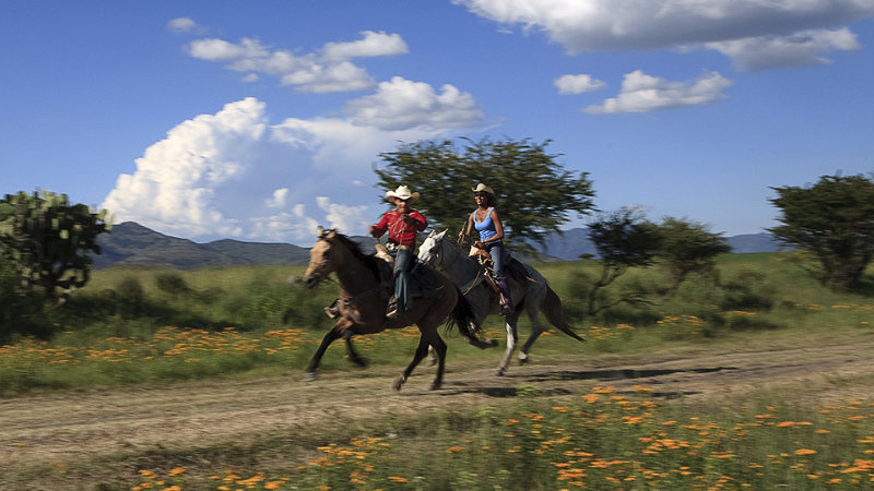 På Colores de Mexico kan du rida hur mycket du orkar och vill. Detta kallas ”open big sky country” då du kan galoppera kilometervis utan att se ett stängsel.