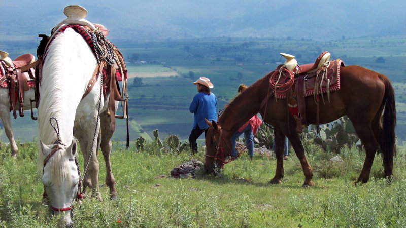 Efter frukost rider ni norrut genom byn Vista Hermosa vilket betyder vacker utsikt. Därifrån, efter en brant klättring, kommer ni upp till Cerro del Ahorcado ”den hängda mannens kulle” med en 360-gradig utsikt över den rosa kyrkan Heroes de Carranza och sjödistriktet. Tillbaka på ranchen kan ni se ut över vattenfallet och äta en arrachera biff tillagad på mexikanskt vis på grillen under det stora ekträdet.