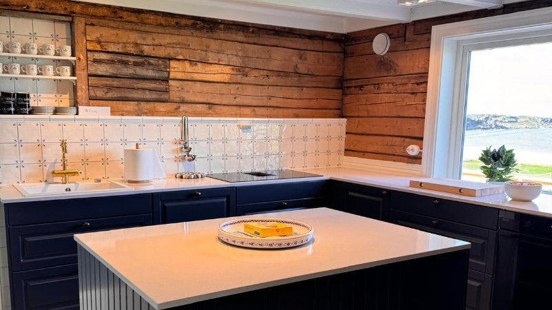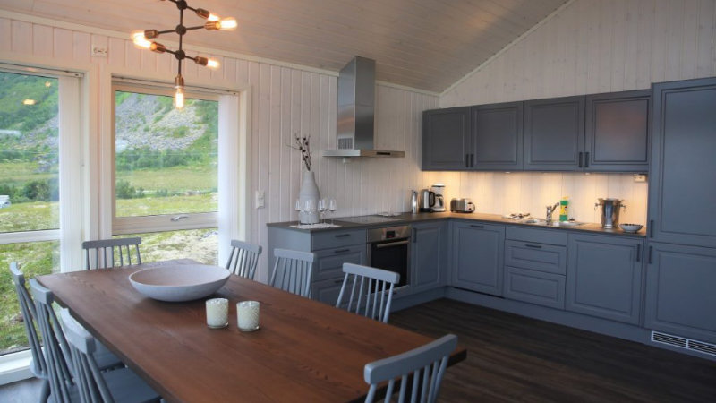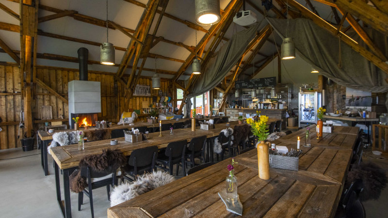 Den nordöstra sidan av ladan har stora glasfönster med utsikt över den vita Hovstranda, midnattssolen och norrskenet. Grannen Anne har gjort de vackra och mycket gedigna borden av hundra år gammalt virke från ett hus i trakten. Lamporna i taket är de ursprungliga mjölkkannorna från gården. I projektet har det lagts ner mycket tid och resurser på renoveringen av byggnaden. Den fina belysningen och takhöjden skapar en unik atmosfär. Den ursprungliga byggnaden är bevarad, samtidigt som den är modern med isolering, ventilation och ett värmesystem som håller gästerna varma och nöjda under alla årstider. En stor öppen spis i glas och mjuka retromöbler skapar en trevlig stämning även under mörka vinterkvällar. Här kan du njuta av en god måltid, med vacker utsikt, eller bara koppla av vid den öppna spisen med en god bok och öl från Lofoten.