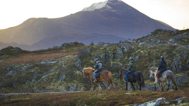 Efter frukost åker ni tillbaka till Tjønndalen för att återförenas med hästarna. Den här gången rider ni västerut mot Vendalsjord innan ni fortsätter uppför Slydalen, Vårliheia och vidare till Kamman (400 meter över havet) och Djupdalen. Ni njuter av utsikten och rider sedan tillbaka till Tjønndalen efter en lunch i bergen.