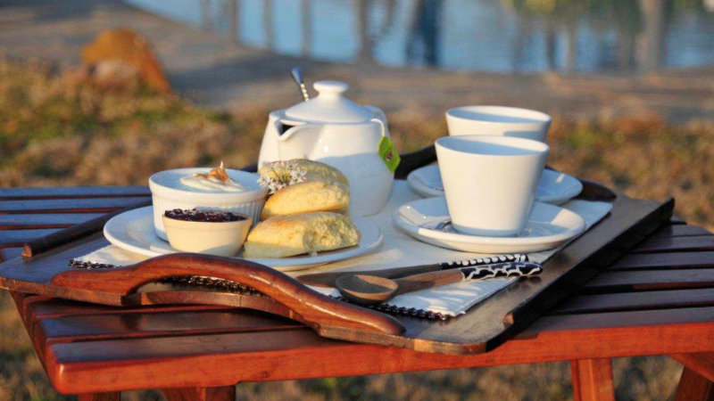 Middagarna är sociala tilldragelser där dagens äventyr och händelser gås igenom. Den noga planerade trerättersmenyn serveras med utvalda sydafrikanska vin. Färska grönsaker och örter ingår i alla recept och dagsfärskt bröd och hembakade kakor avnjuts dagligen.