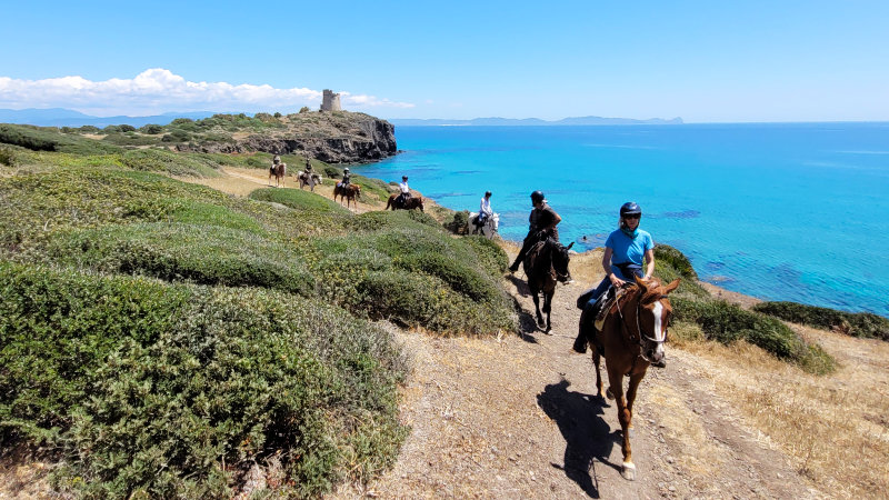 Ni och hästarna körs till östra sidan av ön S.Antioco. I ett före detta stenbrott lastar ni av hästarna och börjar rida till den vackra stranden Maladroxia genom medelhavsvegetationen fram till kustlinjen i söder till den vilda stranden Coe' Cuaddus, vidare till Turri med dess majestätiska 700 år gamla torn som dominerar kusten och dess inre vikar - några sandiga och ibland steniga, det beror på havets nycker.