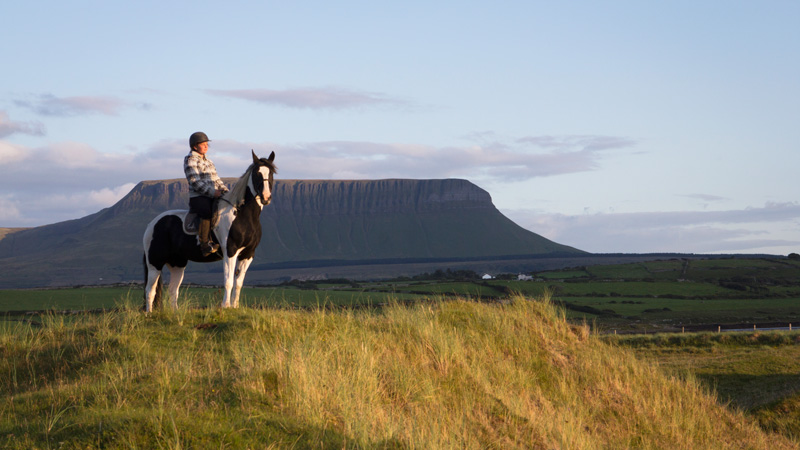 Dag 2 Tisdag. Efter att ha lärt känna din häst med en ridlektion kommer ni att rida på en 2-3 timmars strand- och myrtur. Den kombinerar kust- och landsbygdsupplevelser: ridning vid havet och ridning på den irländska landsbygden. Den första delen tar er längs den Trawalua-stranden. Sedan följer ni lugna stigar och sekelgamla myrspår vid foten av det karga berget Benbulben. Lunch är på gården.