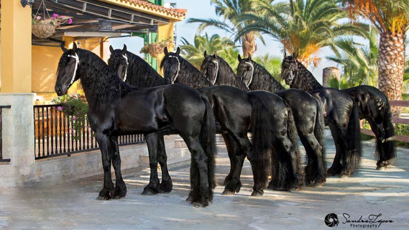 Frieserhästen, som alltid är svart, är en vacker och muskulös häst som rör sig stolt med höga benlyft. Den är ovanlig i och med att den har mycket hovskägg, även om det är en lätt häst. Och den långa, tjocka manen och svansen gör den inte mindre iögonfallande! Frieserhästen är dessutom, med sitt mjuka och vänliga temperament, mycket trevlig att hantera och rida. På anläggningen finns det 80 frieserhästar, inklusive ston, unghästar och föl.