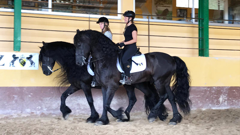 Denna helg går ut på att få umgås och rida dessa vackra frieserhästar. Lektionerna är grupplektioner som fokuserar på grundridning. Flera av hästarna är unghästar som inte hunnit utbildas högt än.