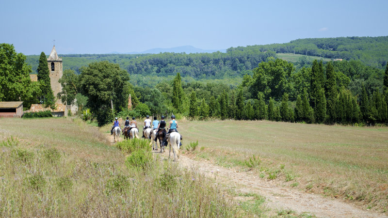 Efter en god frukost förbereder ni hästarna. Idag är målet byn Ravós del Terri med sitt vackra och mycket välbevarade slott. Ni korsar "Serra" genom åkrar och skogar där du kan njuta av fina vyer över den norra regionen Girona, till Pyrenéerna med dess snötäckta berg. Efter picknicken kommer ni tillbaka till gården längs en slät stig kantad av jordbruksmark och bondgårdar, den typiska landsbygden i Katalonien.
