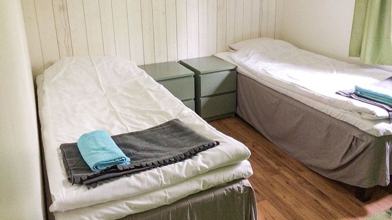 Boendet är enkelt men genomtänkt och vackert integrerat i miljön. Du bor bekvämt i ett av de två gästhusen på gården. Boendet är sjönära i dubbelrum med delat badrum – ofta med utsikt över vatten eller skog. Här handlar det inte om lyx i vanlig mening, utan om tystnad, eldens värme och att vakna till fågelsång. Du sover mitt i naturen – bokstavligt talat.