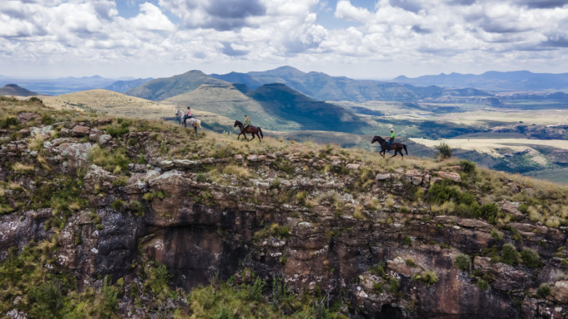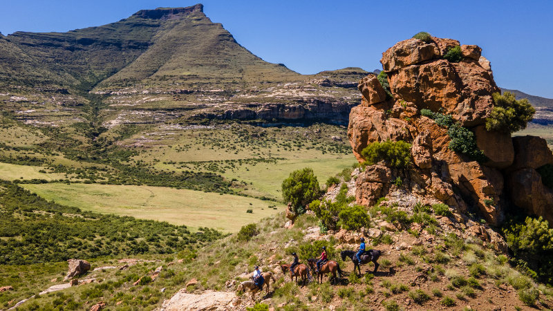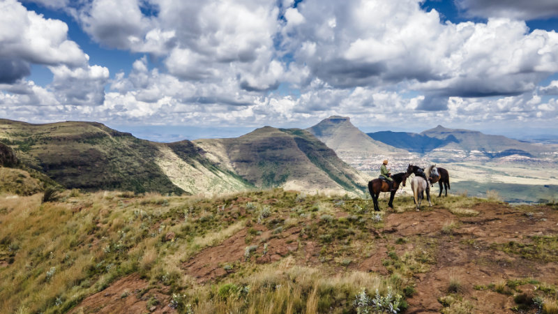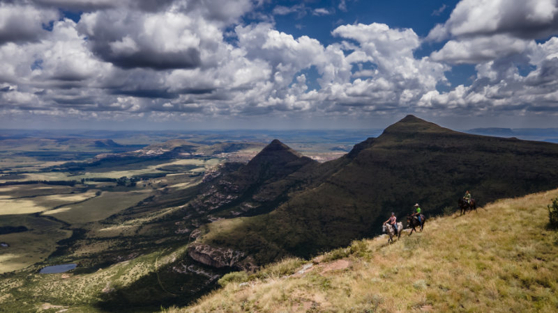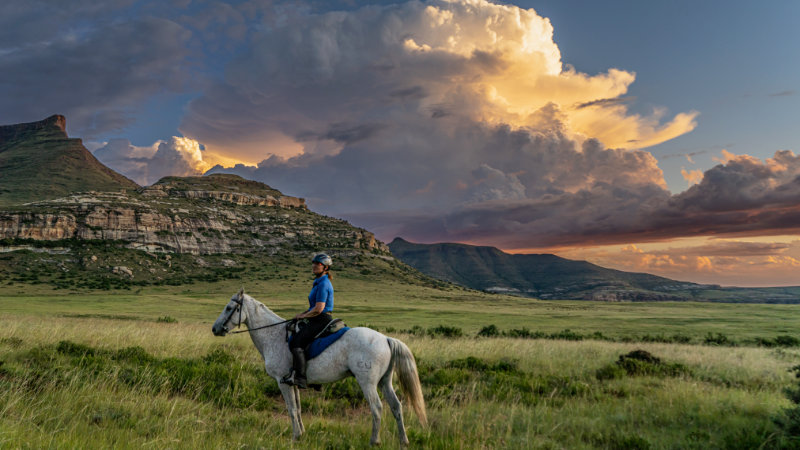 Dag 2: Frukost på verandan följt av en morgonritt på 4 timmar. En hänförande tur genom donga-skogen med spännande galopper uppför branta stigar, som följer en vacker rutt upp i bergen med fantastiska vyer mot Lesotho.