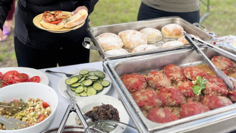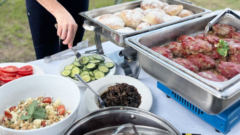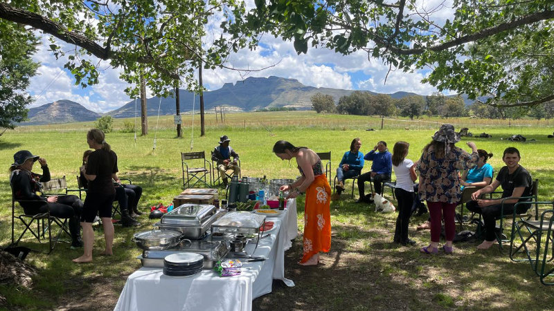 Middagen består av traditionell sydafrikansk mat, inklusive lamm från reservatet, lokalt odlade grönsaker och utsökta desserter.