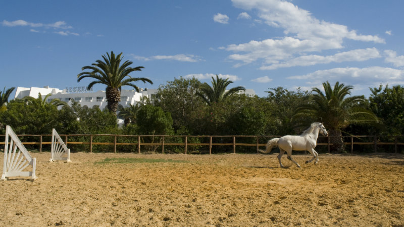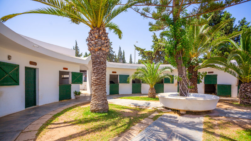 Mitt i den stora trädgården ligger stallet vackert inbäddat bland palmträd och blommor på hotellets 7 hektar stora ägor.. Här träffar du stallchefen Hedi som har en gedigen fransk instruktörsutbildning. Hotellet och ridcentret är familjeägt och Hedi är sedan länge en vän till familjen. Hästhållningen håller svensk standard och hästarna är harmoniska och i gott hull. Hedi och hans personal sätter hästarna i centrum och utbildar hästarna på ett väldigt mjukt och trevligt sätt vilket märks tydligt. De är korsningar mellan det vackra arabiska fullblodet och den kraftfulla berberhästen (150-160 cm). Det finns även två söta ponnyhingstar.